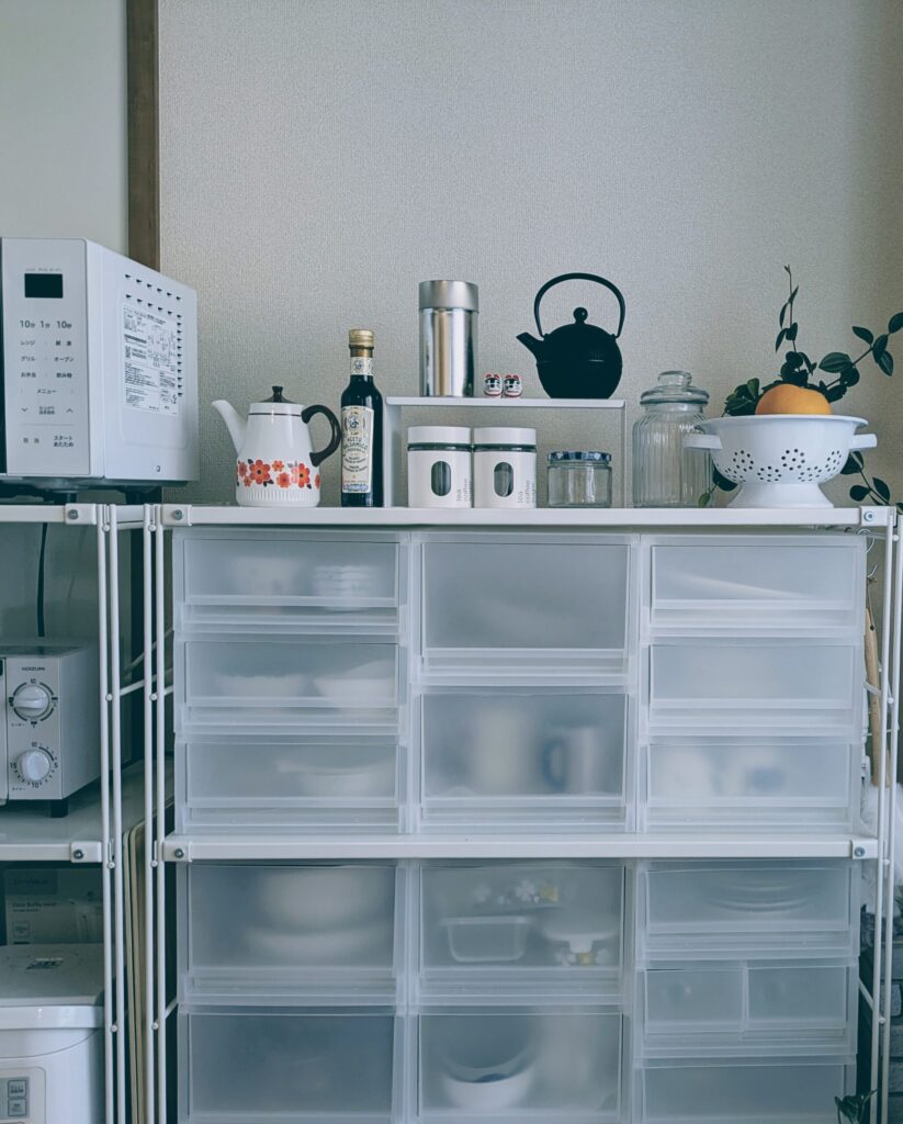 棚の上には、無印のポリプロピレン小物収納ケースを並べています。このケースは、本来は小物を入れるためのものだと思います。
